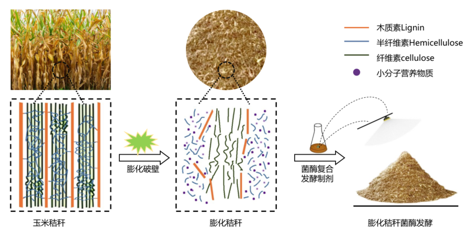 秸秆“破壁+菌酶”联合处理饲料化利用技术示意图