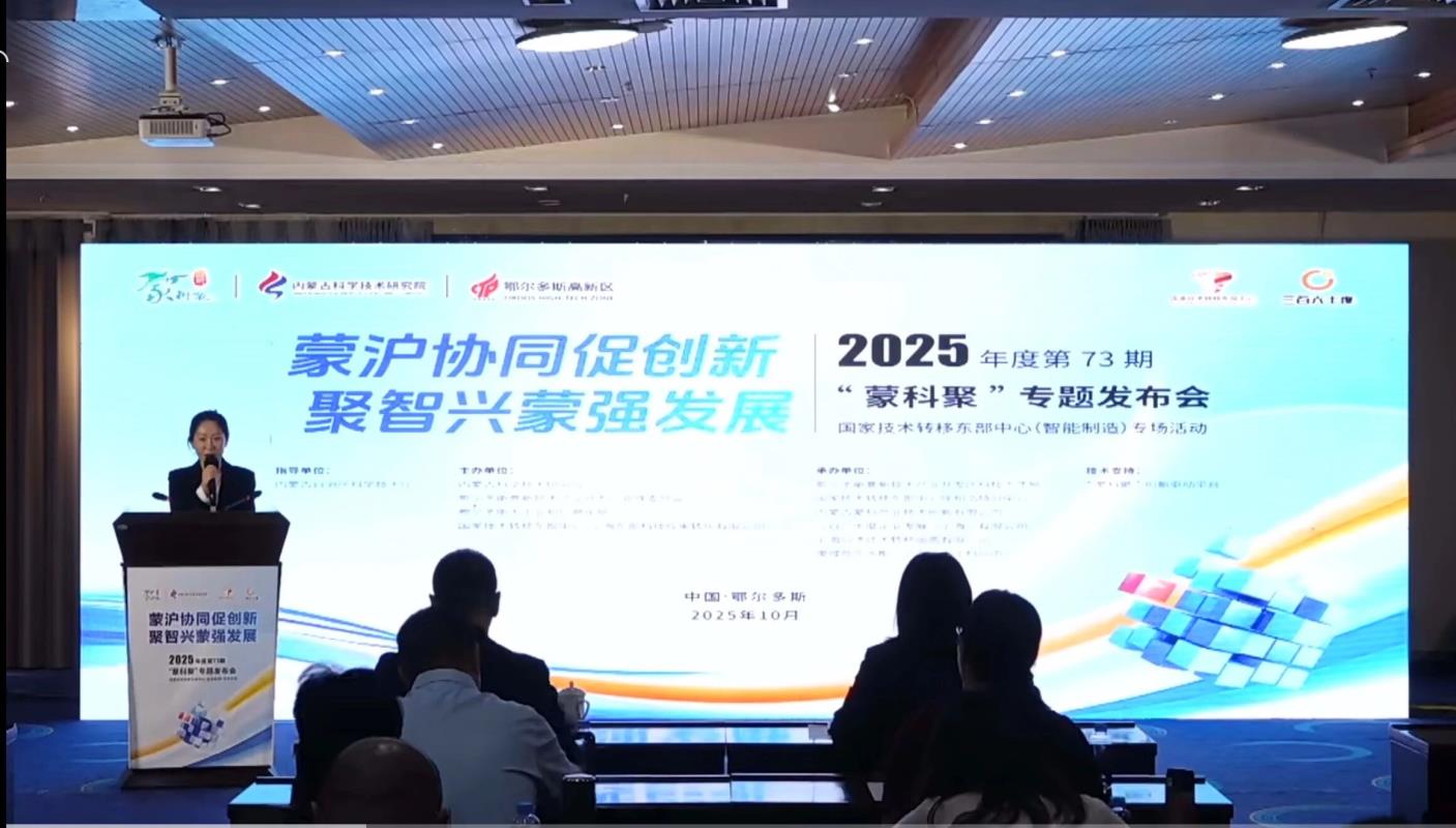10月29日,由内蒙古科学技术研究院、鄂尔多斯高新技术产业开发区管理委员会、鄂尔多斯市工业和信息化局、国家技术转移东部中心(上海东部科技成果转化有限公司)联合主办的2025年第73期“蒙科聚”专题发布会——国家技术转移东部中心(智能制造)专场活动在鄂尔多斯举行。